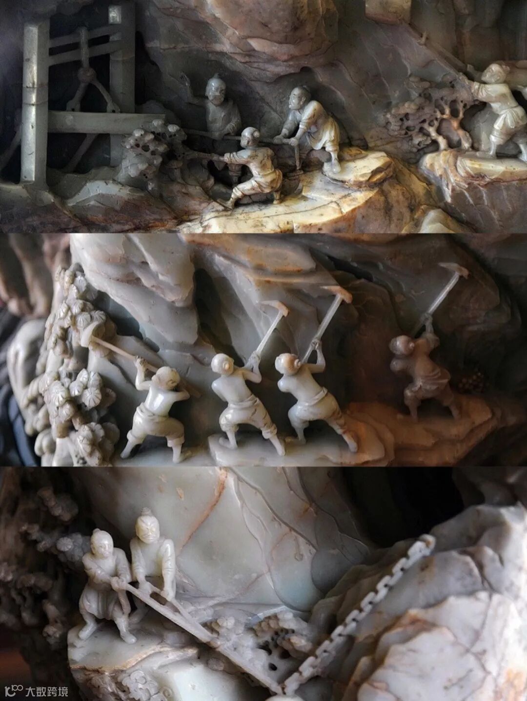 这座玉山高224厘米,最宽96厘米,重达5000多公斤。器周琢崇山峻岭、流泉飞瀑、古树苍松,在险峻的险崖峭壁上,聚集着成群结队的人在开山劈石。他们有的锤钎凿石,有的镐刨沙砾,有的提石打桩,一派繁忙的劳动场面。