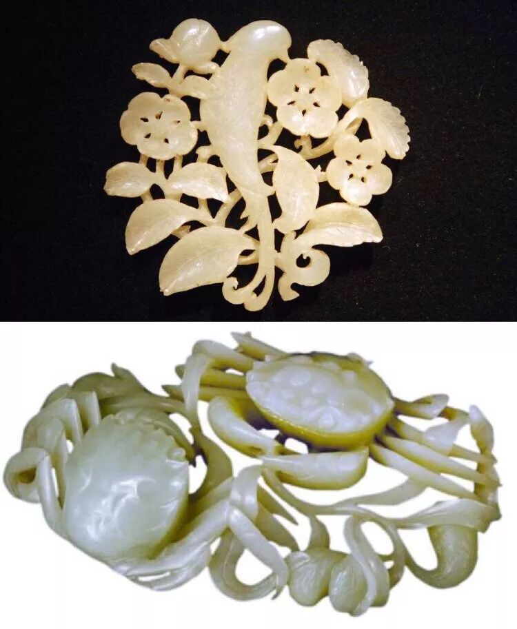 比如,金代的绶带花鸟形玉佩和清代的和田白玉双蟹镇纸。