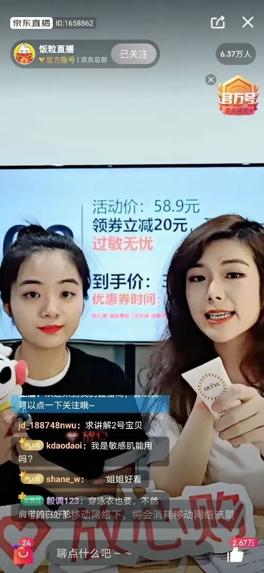 ▲京东客服冰冰(左)与“饭粒直播”主播朵朵介绍提供过敏无忧服务的防晒霜