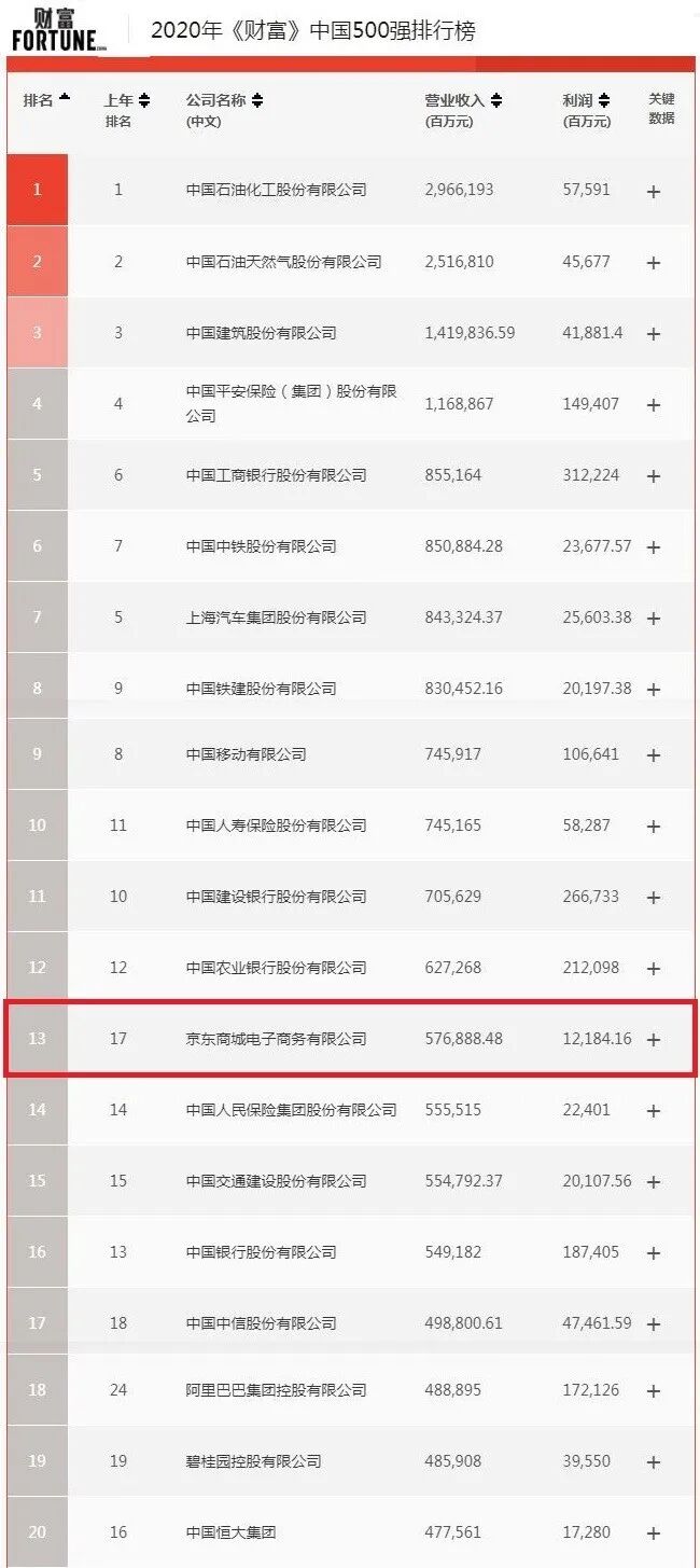7月27日,财富中文网发布了2020年《财富》中国500强排行榜,京东集团凭借高质量增长的零售业务和高速发展的服务业务,排名上升4名至13名,成为排名第一的“互联网服务与零售”企业。