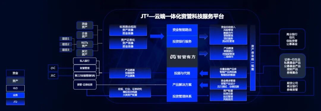在这里,我们所定义的JT²,既是一个云端一体化资管科技服务平台,拥有更加智能化的系统和工具,能够帮助金融机构解决效率问题;又是一个生态层面的开放平台,能够提升各类资金和资产的联结性,从而更方便资管机构进行跨市场、跨品种、跨机构的交易。