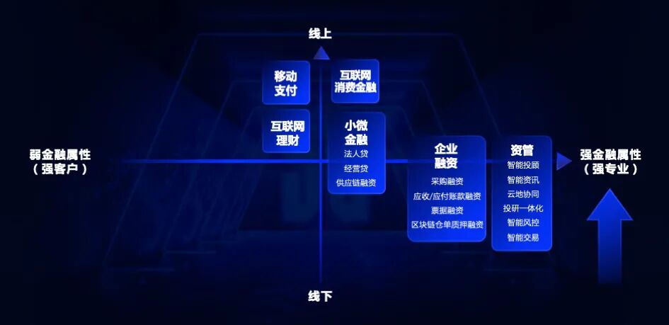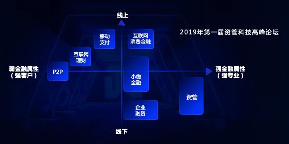 在去年的第一届资管科技峰会上,我们提出,金融科技开始进入下半场,而资管科技是下半场的核心。当时,我们画了这样一张图。我们认为,进入金融科技下半场,金融机构将不局限于上半场对互联网流量的追逐,而是要实现从纯线上到线上线下相融合,从弱金融到强金融的转变。换句话说,未来的行业趋势是,第四象限的业务在金融科技的驱动下,不断向线上移。