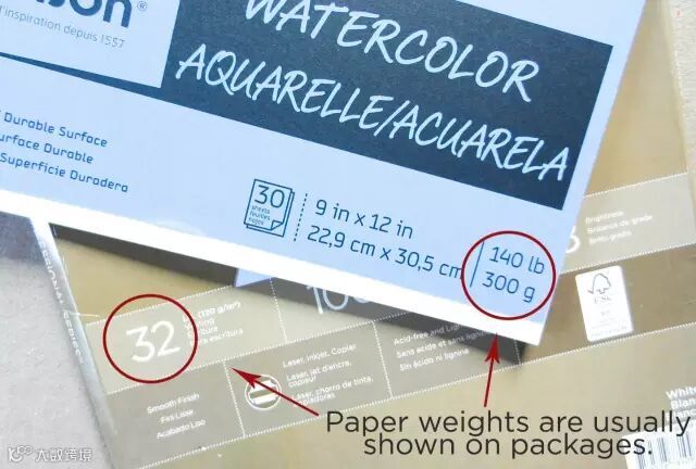 如图所示的这两张11″x14″尺寸纸,就被标上“140磅纸”的标记。