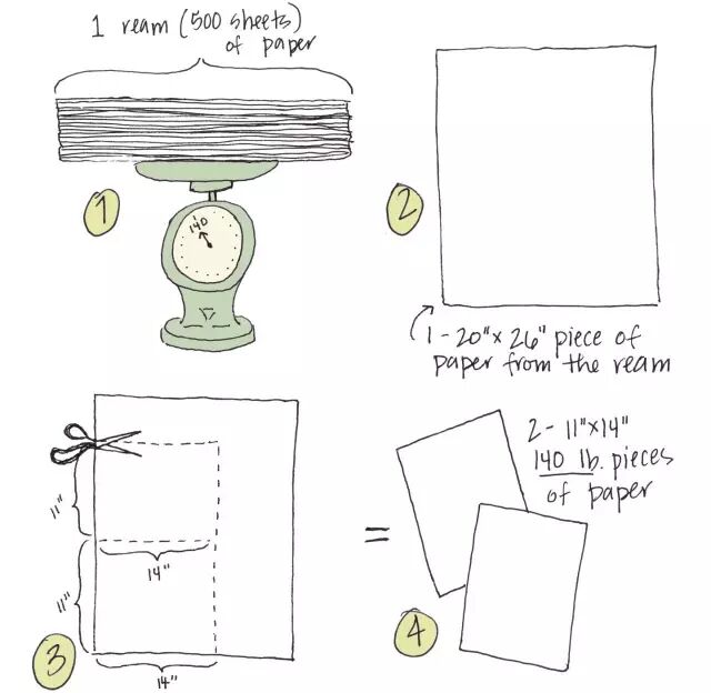 ❶ 先将特定尺寸 (如20″x26″) 的500张称重。这500张纸,就叫“一令纸”。