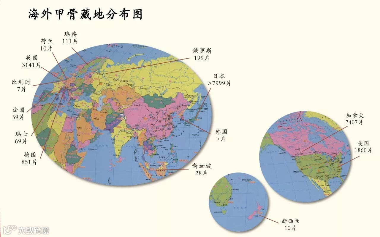 此外,台湾地区的“中央研究院”和台湾历史博物馆等机构也共收藏了总数超过30000片的甲骨。