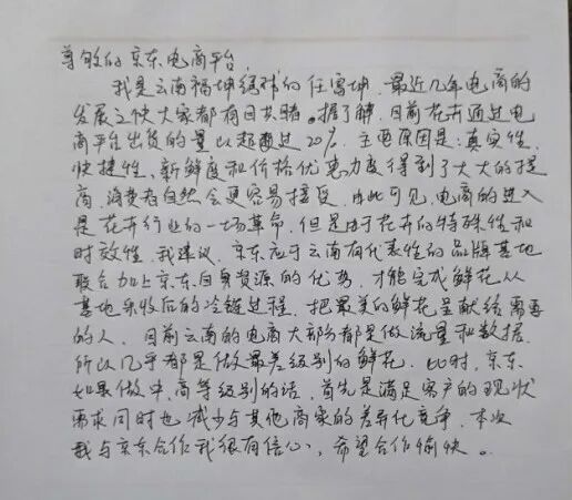 为解决云南地区花农因疫情滞销的情况,京东鲜花平发挥平台整合能力,联系京东直播,协调基地端、花艺教育端等社会资源,在疫情特殊时期,带领花农开启线上直播带货销售新模式。活动上线来覆盖帮扶了昆明多家优质鲜花基地数十家花农,借助京东各频道流量支持,积极联系花店分销,曾在单场直播中半小时销售近万枝。基地老板由此发起诸多感慨表达对京东平台的信心,并手写感谢信期待后续更加深入的合作。