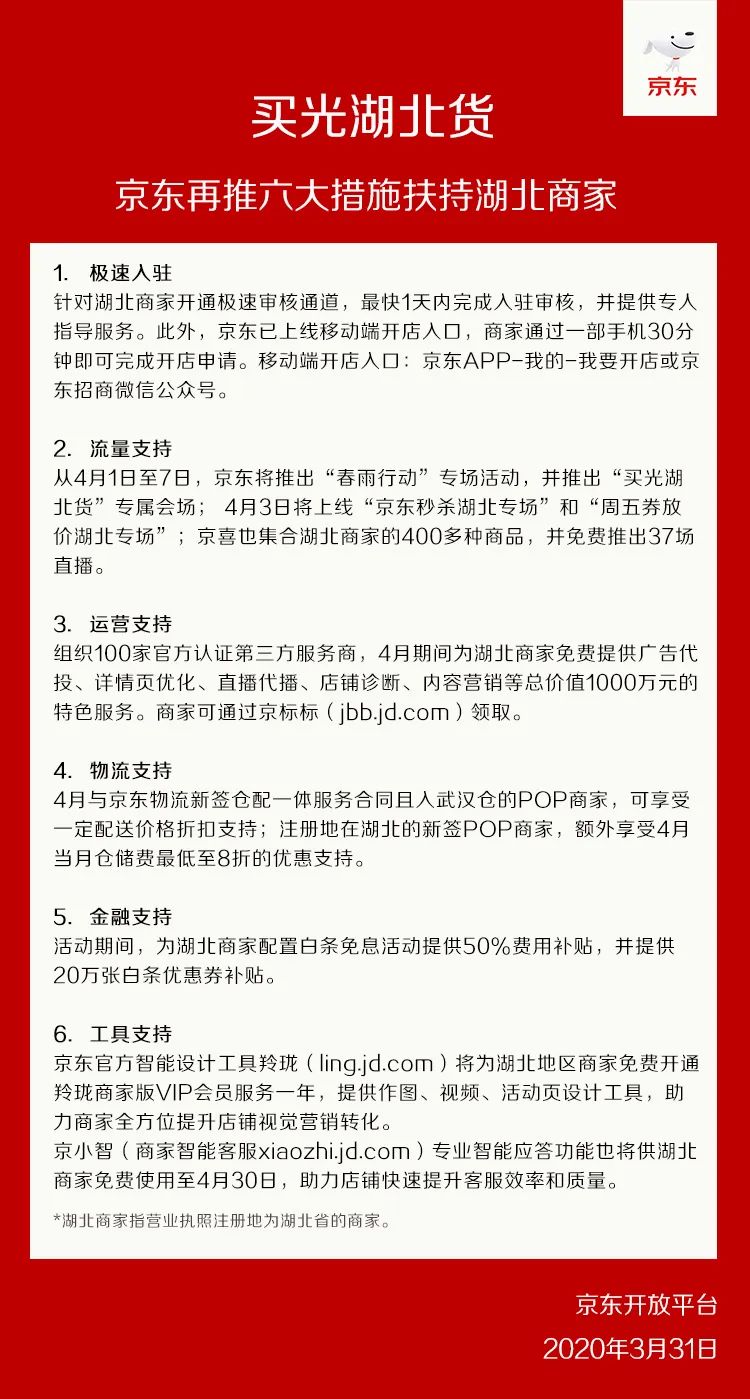 此外,运营支持方面,京东将组织100家官方认证第三方服务商,为湖北商家免费提供总价值1000万元的各项运营服务。
