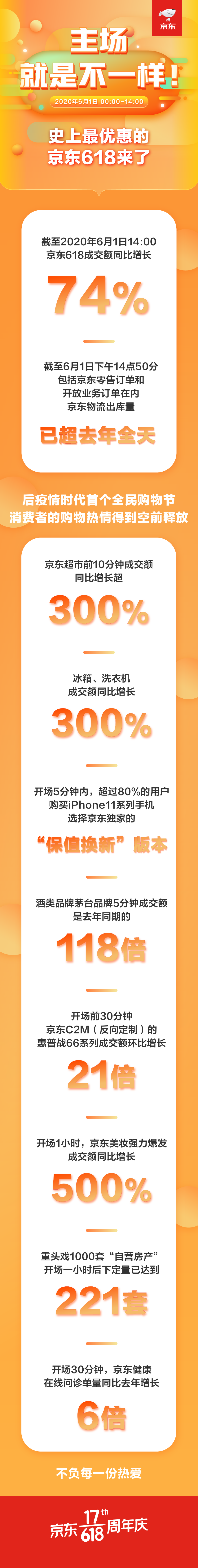 截至6月1日下午14:00 ,京东618成交额同比增长74%,充分彰显了疫情也无法阻挡的中国消费市场成长动能。京东物流等服务体系迅捷响应消费需求,截至6月1日下午14点50分,包括京东平台订单和开放业务订单在内,京东物流出库量已超去年全天。