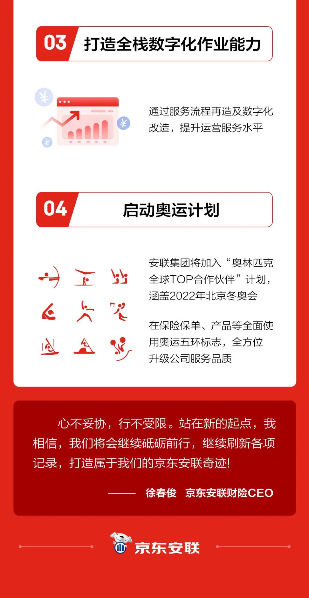 京东安联CEO徐春俊表示,心不妥协,行不受限,站在新的起点,我相信,我们将会继续砥砺前行,继续刷新各项记录,打造属于我们的京东安联奇迹!