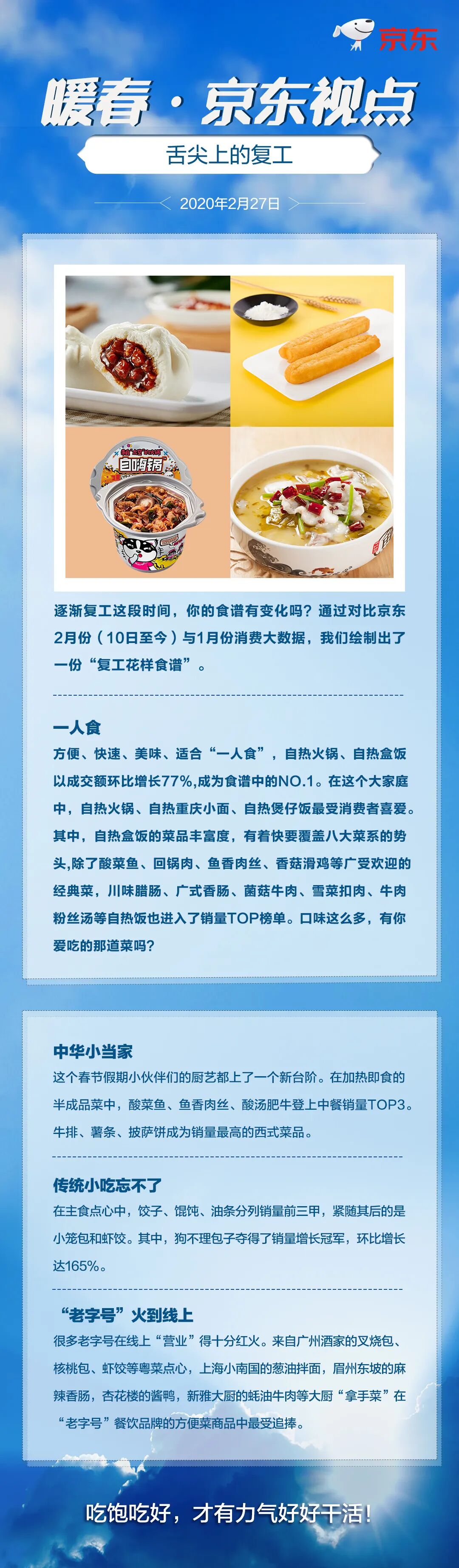 京东大数据分析发现,原来方便快捷、适合“一人食”的自热火锅、自热盒饭才是复工食谱中的NO.1。
