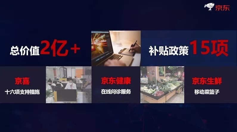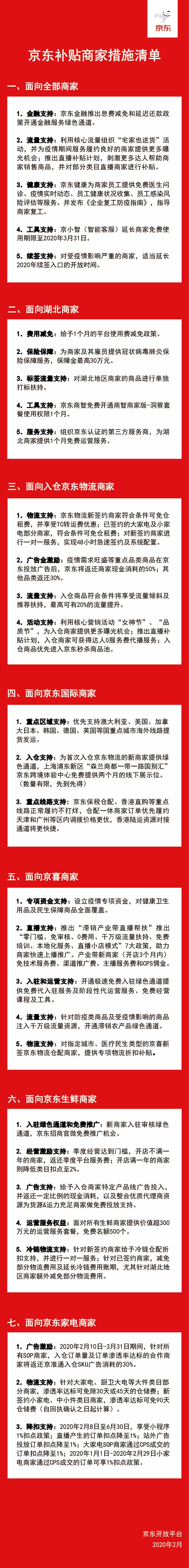 为了与商家共渡难关,京东于2月2日和2月8日分别推出面向全体商家和入仓京东物流商家的补贴扶持措施,总价值超过2亿元。之后京东又陆续推出面向家电、生鲜、健康、京东国际和京喜等商家的补贴举措。