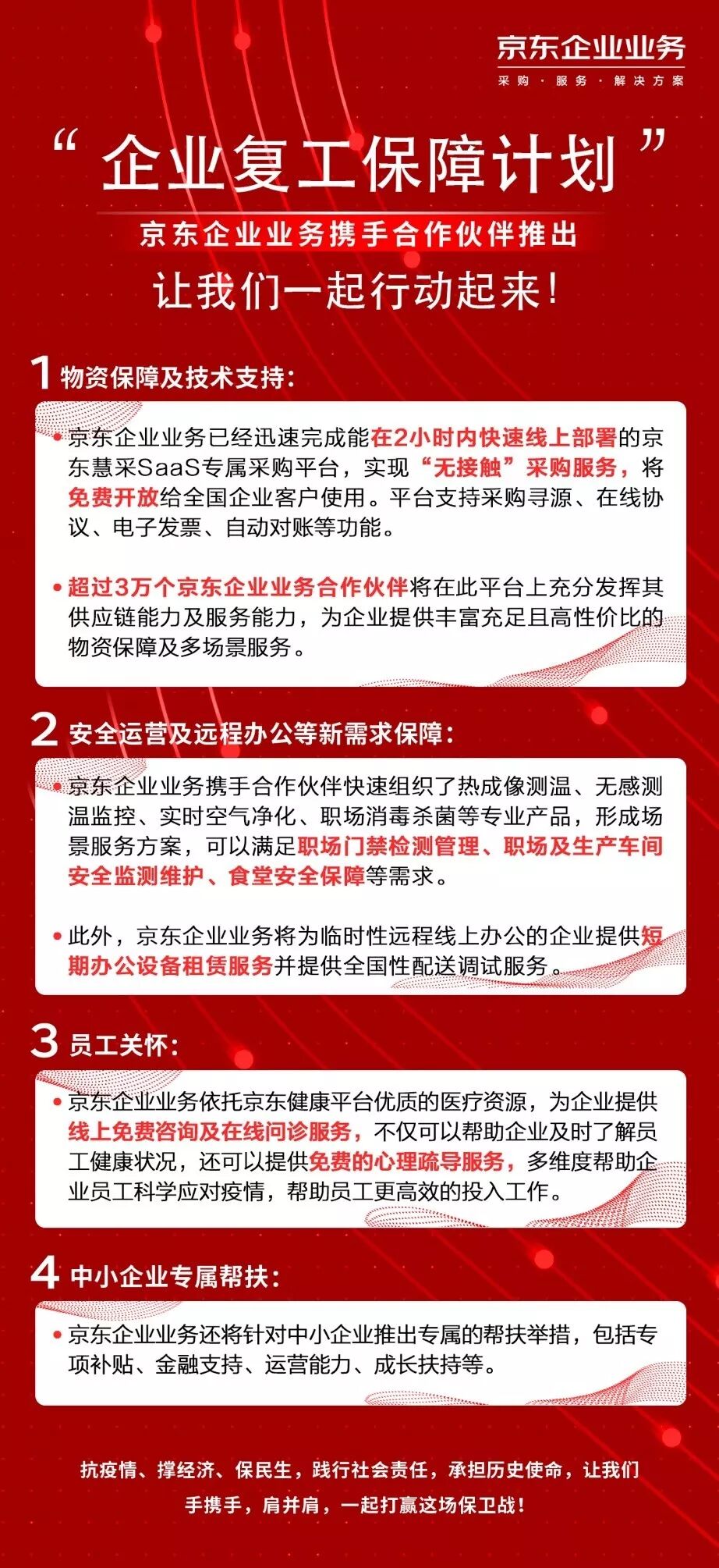 目前,“企业复工保障计划”收到越来越多的企业市场一线品牌和防疫专业设备品牌的积极响应,京东企业业务也呼吁更多合作伙伴加入,提供更多元、更有力的保障服务,为更多企业的复工复产提供全方位支撑。抗疫情、撑经济、保民生,践行社会责任,承担历史使命,手携手,肩并肩,让我们一起打赢这场保卫战!