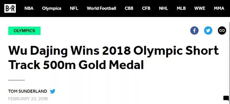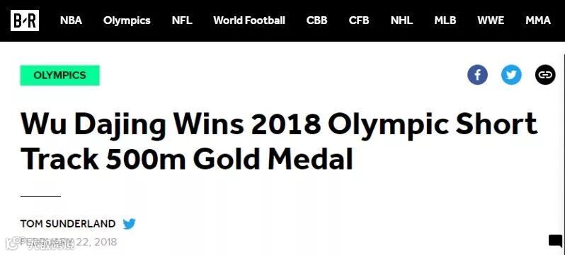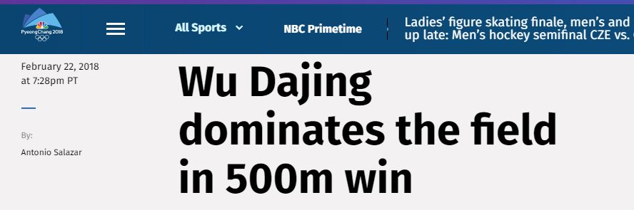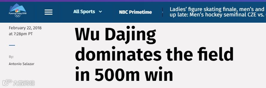 美国全国广播公司奥运频道(NBC Olympics)在标题中使用了“dominate”一词,武大靖在赛场的逆天实力可见一斑。