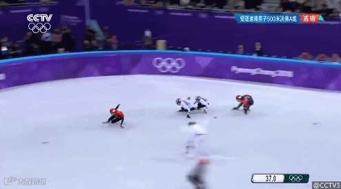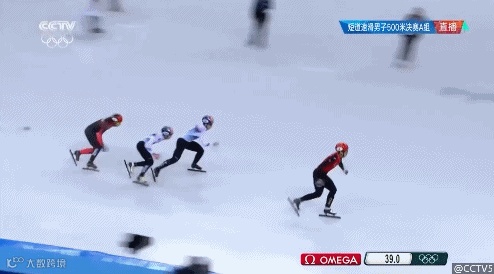 2014索契冬奥会银牌得主武大靖在江陵冰上运动场上以39.584秒的成绩飞过终点线。韩国选手黄大宪和林孝俊分获二三名。