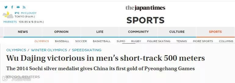 日本英文媒体《日本时报》(Japan Times)用fly(飞过)描绘武大靖冲过终点的瞬间,可以说十分到位了!