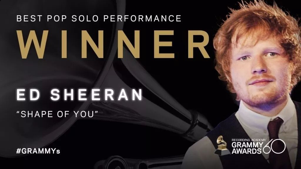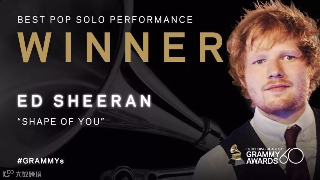 今年,Ed Sheeran终于拿到格莱美,还不止1个!其中,凭《Shape of You》获得最佳流行歌手。