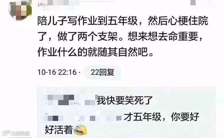 说到陪伴与成长,最贴切的例子莫过于:陪孩子写作业!这里请容我先大笑三声,哈哈哈……尤其是看到一位家长陪孩子写作业到五年级,竟急出了心梗(myocardial infarction),严重到需要进行支架手术!事后,这位家长感慨道“想来想去还是命重要,作业什么的就顺其自然(let nature take its course)吧”。