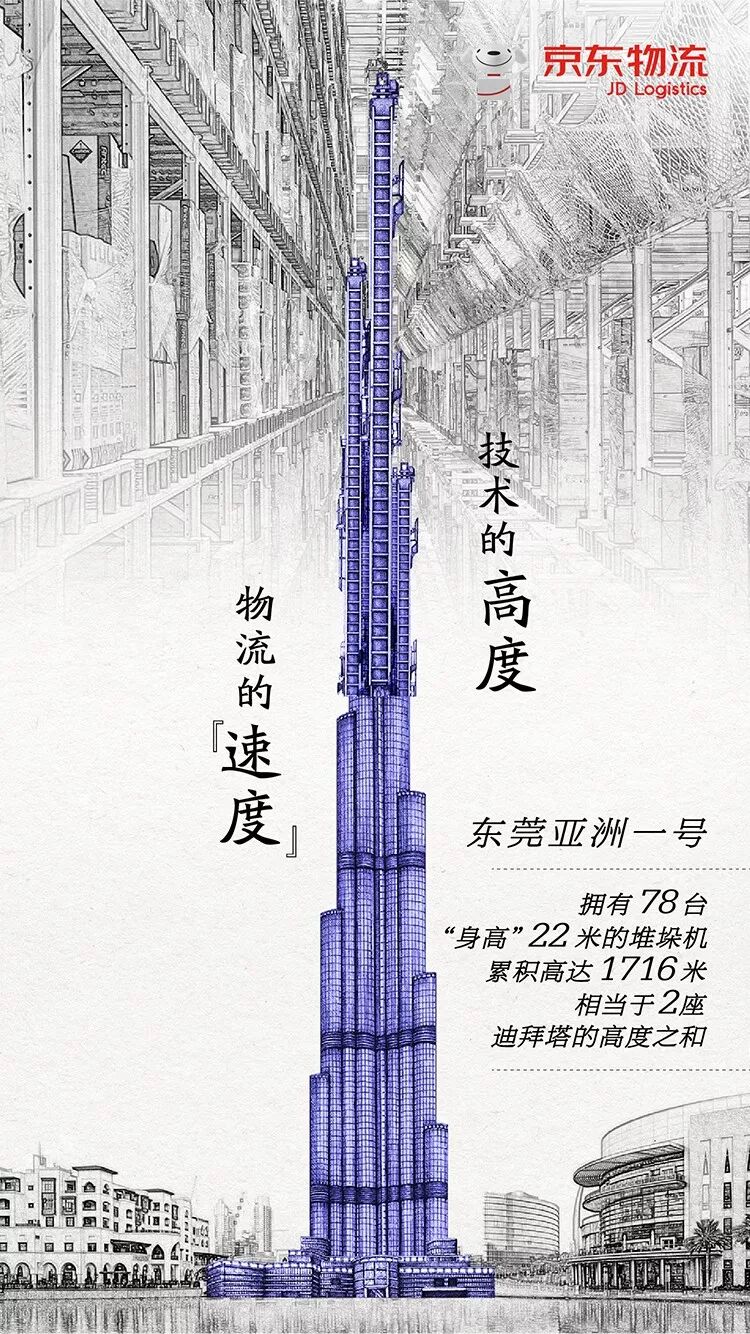 目前已知的,已经建成的世界第一高楼——迪拜塔高达828米,楼层总数162层,为了修建迪拜塔,共使用33万立方米混凝土、6.2万吨强化钢筋、14.2万平方米玻璃。而东莞亚洲一号使用的智能化的堆垛机,每个“身高”22米,共有78个,累计高度1716米,是世界第一高楼的2倍。这让自动立库中的商品存储、上架和拣货更加迅速与便捷。技术的高度,物流的速度。