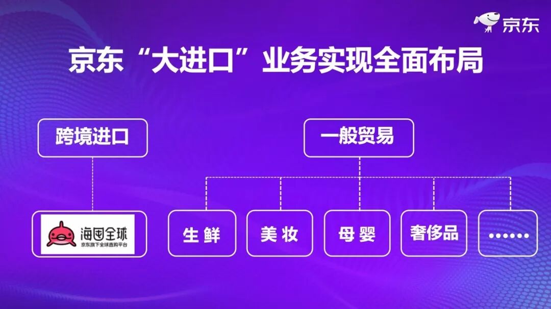 而在一般进口贸易业务上,京东已经打通了进口商品全通路。在奢侈品方面,目前除了200多家奢侈品品牌官方入驻京东,还有全球顶级时尚垂直电商Farfetch官方入驻带来的600多个品牌,超过100多万种商品,集结了现在市面上近乎所有的奢侈品牌;在电子消费方面,京东已经成为微软、戴尔、罗技、戴森、飞利浦、三星等多个品牌在中国甚至亚太地区的最重要销售渠道;在生鲜方面,京东生鲜将来自全球的新鲜好物直达消费者餐桌,目前,京东已成为新西兰奇异果、智利车厘子,泰国榴莲、黑虎虾等生鲜产品的国内线上最大销售平台;在日用品方面,京东超市已成为宝洁、花王、雀巢、美赞臣、金龙鱼等知名国际快消品牌的全渠道最大零售商。