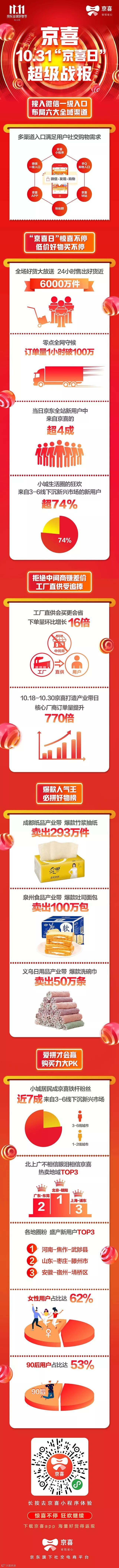 在10月31日“全民京喜日”,来自四川成都纸品产业带的竹浆抽纸,全天卖出293万件;来自福建泉州食品产业带的软吐司面包,卖出超过100万包;来自浙江义乌日用品产业带的洗碗巾,卖出超过50万条……从整体数据上看,工厂直供的订单量环比增长16倍。