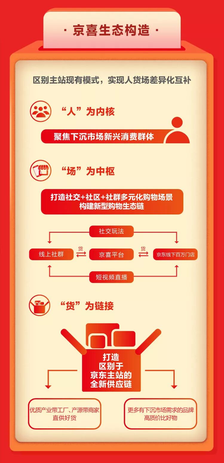 今年,京东打造了区别于京东主站现有场景和模式的全新平台——京喜,于9月19日正式上线。京喜聚焦于下沉新兴市场消费人群,通过高质价比好货及丰富的社交玩法,与京东主站实现了“人”、“货”、“场”的差异化互补。