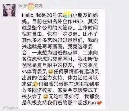 另一位参加竞选的妈妈也“低调”秀出实力,她表示,自己作为某知名外企的人力资源总监,工作时间相对自由,有一定资源:
