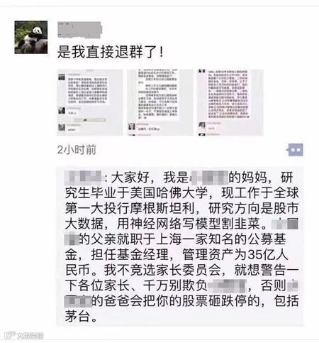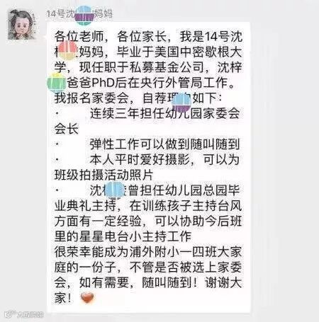 其中一位妈妈写道:“我毕业于美国中密歇根大学,现任职于私募基金公司。”她还称,自己的丈夫博士毕业,在央行外管局工作。