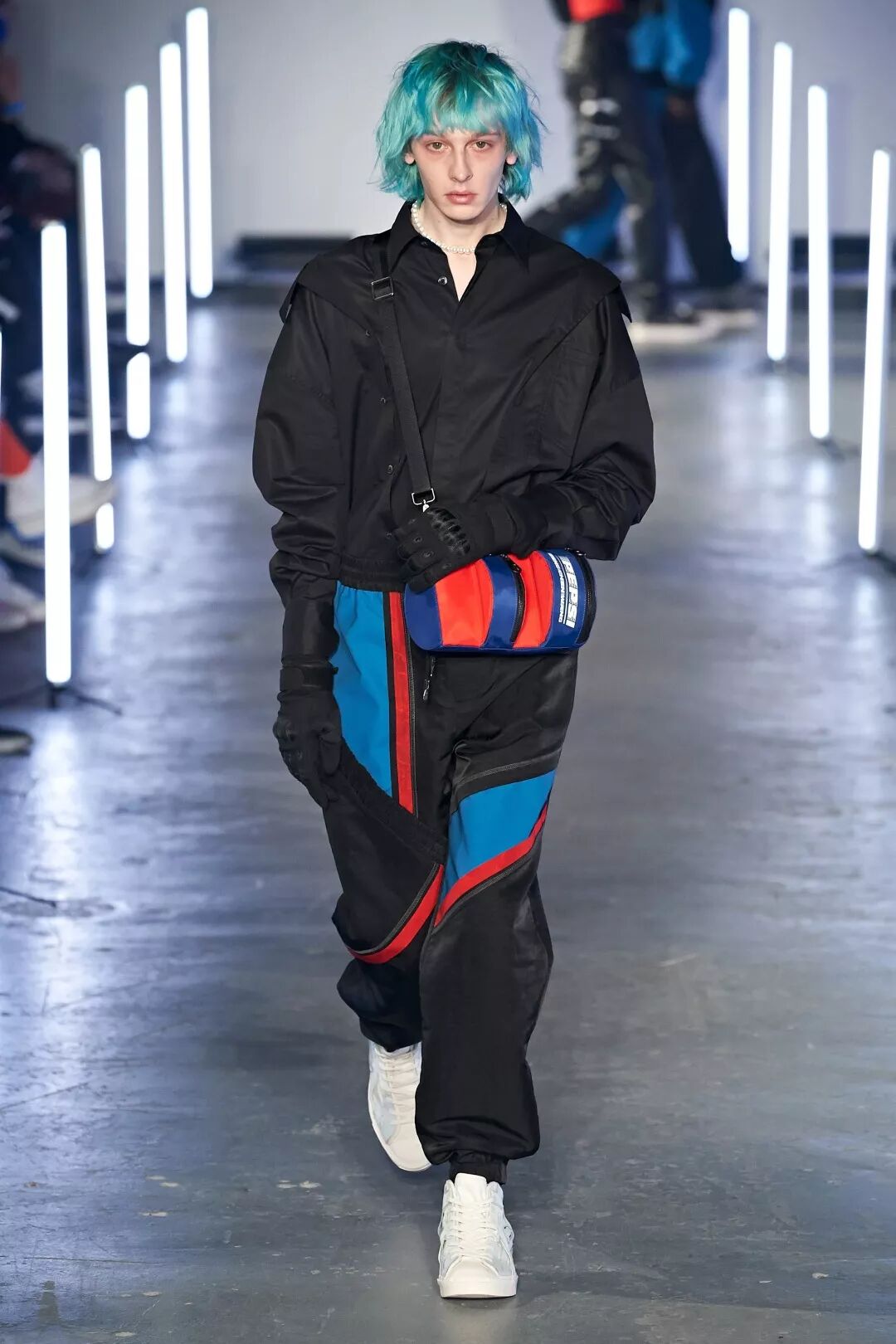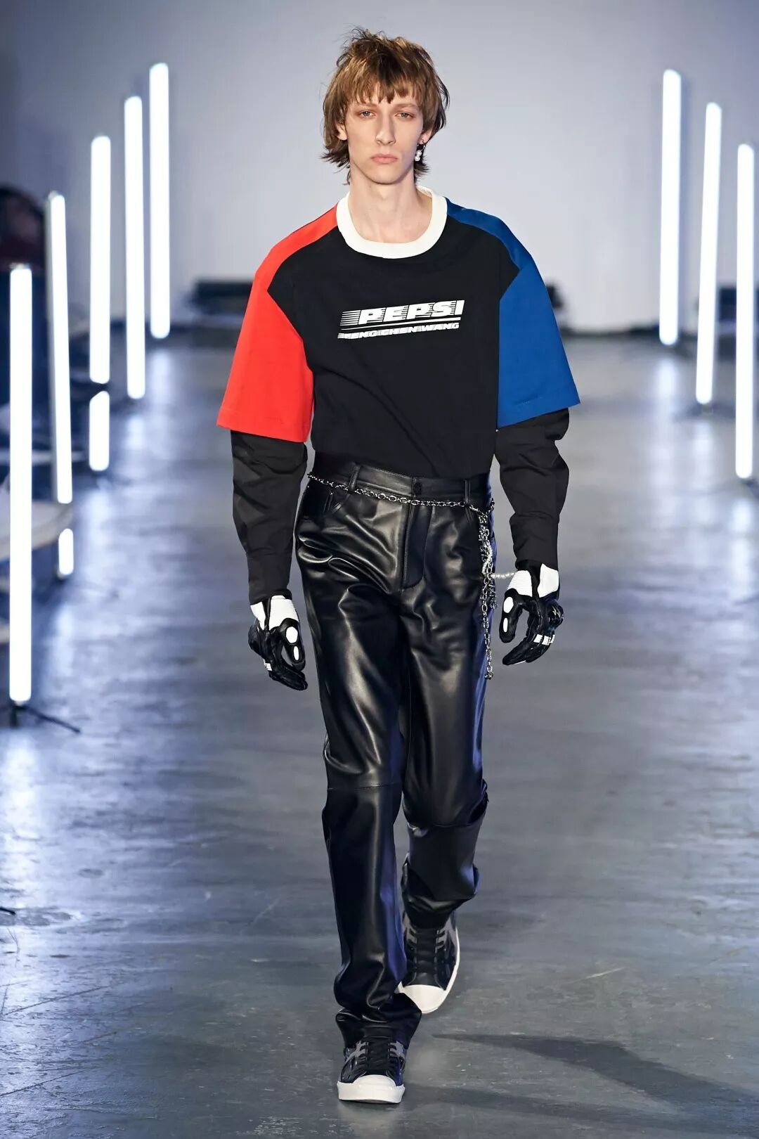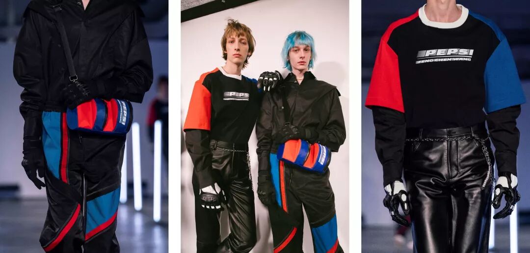 2020秋冬系列发布会上亦首次展示了品牌与百事可乐的合作。两款合作单品印有Pepsi和 Feng Chen Wang的套头衫和包包也在秀当天在京东独家首发预售。套头衫将短袖和衬衫进行二次解构拼接,为单品增添层次玩味;双领口错位的解构加上百事经典颜色的拼接撞色设计,整体独特吸睛,彰显特立独行的时尚个性;胸前Pepsi与FengChenWang字母组合再设计,logo动感十足,给人活力四射的感觉。撞色立体包则使用了百事可乐蓝红色的经典瓶罐造型与Feng Chen Wang 的经典立体字“F"字造型相结合,塑造了具有强烈醒目的视觉冲击力,蓝红的背包配色和logo使视觉效果更加简约有力。