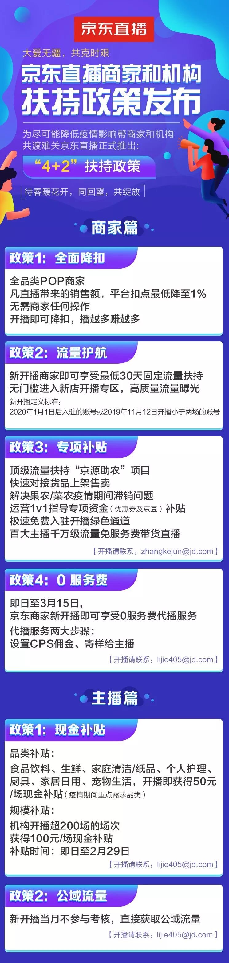 为尽可能降低疫情影响,与商家机构和主播红人共渡难关,2月12日,京东直播宣布正式推出针对商家和机构“全面降扣、流量护航、专项补贴、0服务费”和针对主播“现金补贴和公域流量扶持”的“4+2”政策。