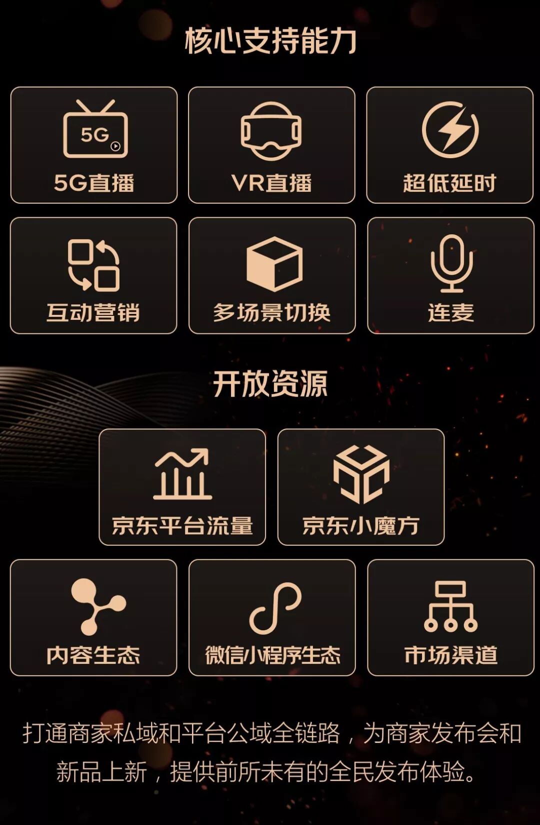 京东直播将以5G直播、超低延时、互动营销、多场景切换、连麦等核心支持能力,并开放京东平台流量、京东小魔方、内容生态、微信小程序生态、市场渠道等资源,打通商家私域和平台公域全链路,为商家发布会和新品上新提供前所未有的全民发布体验。