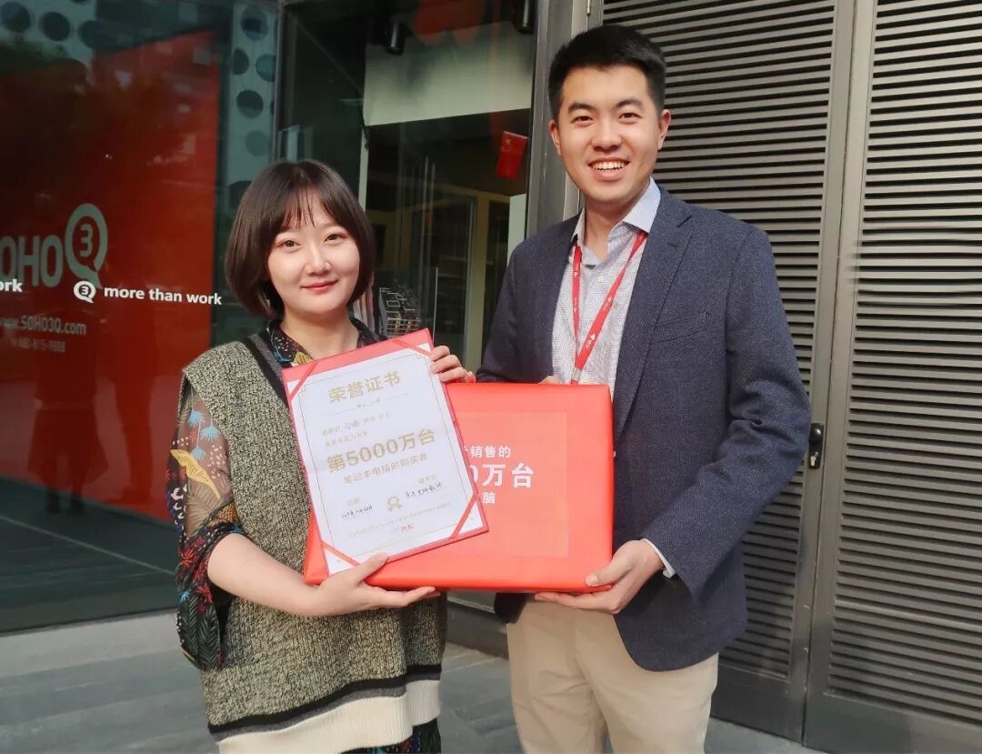 ▲京东零售集团笔记本业务部总经理李亚龙与京东第5000万台笔记本电脑购买者合照