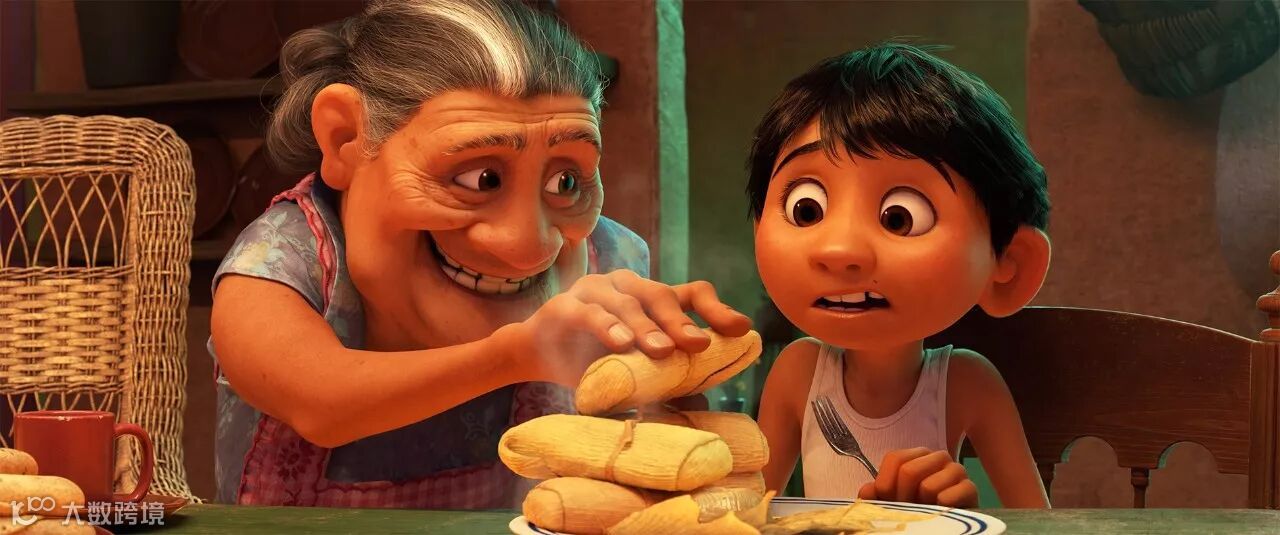 米格尔的太奶奶Coco深棕色的皮肤上满是皱纹,梳着小辫子,跟我奶奶极其相似。奶奶严厉有加,又常宠着孙子。上一秒还拿着拖鞋教训人,下一秒就溺爱地喂小孙子吃玉米粉蒸肉,这跟我妈不是不像的。电影中哥哥姐姐、伯父伯母热热闹闹一家人住在一起,这在拉丁裔家庭中也很常见。