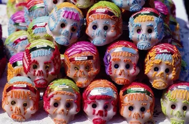 在墨西哥,骷髅头是亡灵节上的必备单品。人们会画上骷髅妆、或者戴着骷髅面具,把自己打扮成一个美美的骷髅到处玩耍。街头满满的都是妖艳小骷髅:
