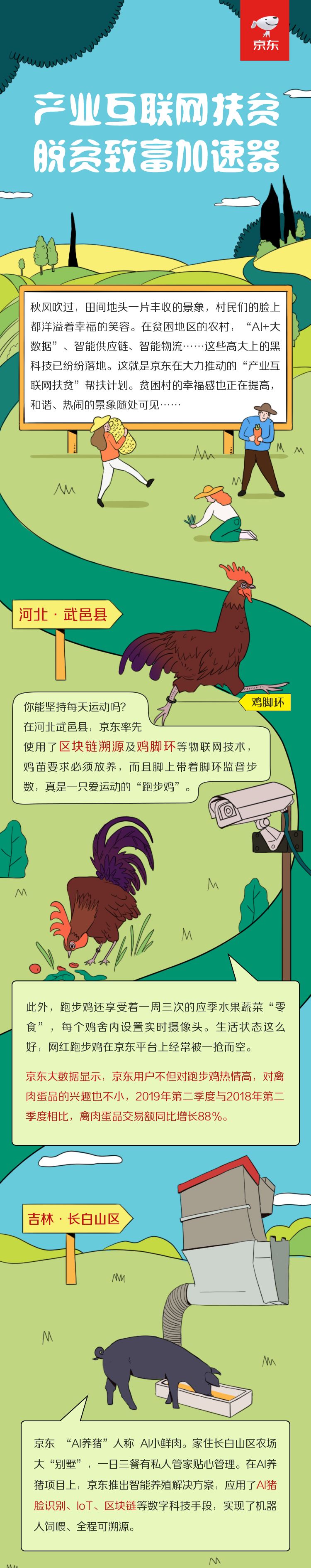 以京东2016年在河北武邑县落地的“扶贫跑步鸡”项目为例,京东跑步鸡在业界率先使用了区块链溯源及鸡脚环等物联网技术,对于跑步鸡160天的全养殖周期进行监测,通过互联网技术对于养殖过程进行追溯,保证产品的绿色、健康。“跑够100万步”才上市成为京东跑步鸡的网红标签,在京东平台上经常被一抢而空。