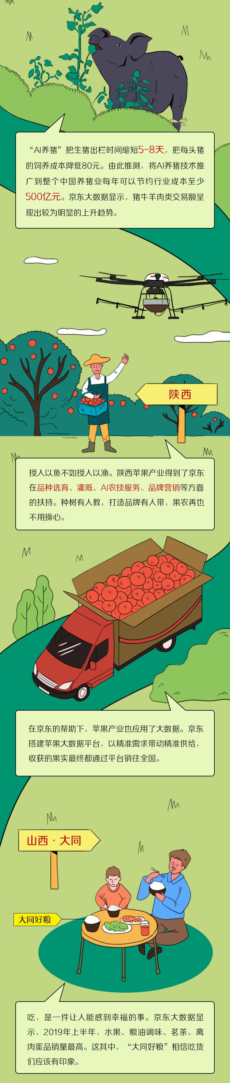 在陕西,京东农业云围绕陕西苹果产业在品种选育、灌溉、AI农技服务、品牌营销等方面的需求,携手农业领域龙头企业成立“京东云数字果业联盟”,为当地苹果产业提供全产业链服务,搭建苹果大数据平台,以精准需求带动精准供给,为当地苹果产业发展、营销定位、以销带产提供有力支撑。