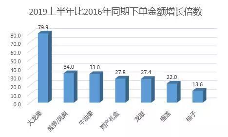 京东大数据显示,水果是最受消费者青睐的贫困地区农产品,占到33.6%的市场份额。其中火龙果、凤梨、牛油果是最受追捧的水果,2019年上半年下单金额比2016年同期分别增长了79.9倍、34倍和33倍,成为不可不扣的扶贫网红特产。