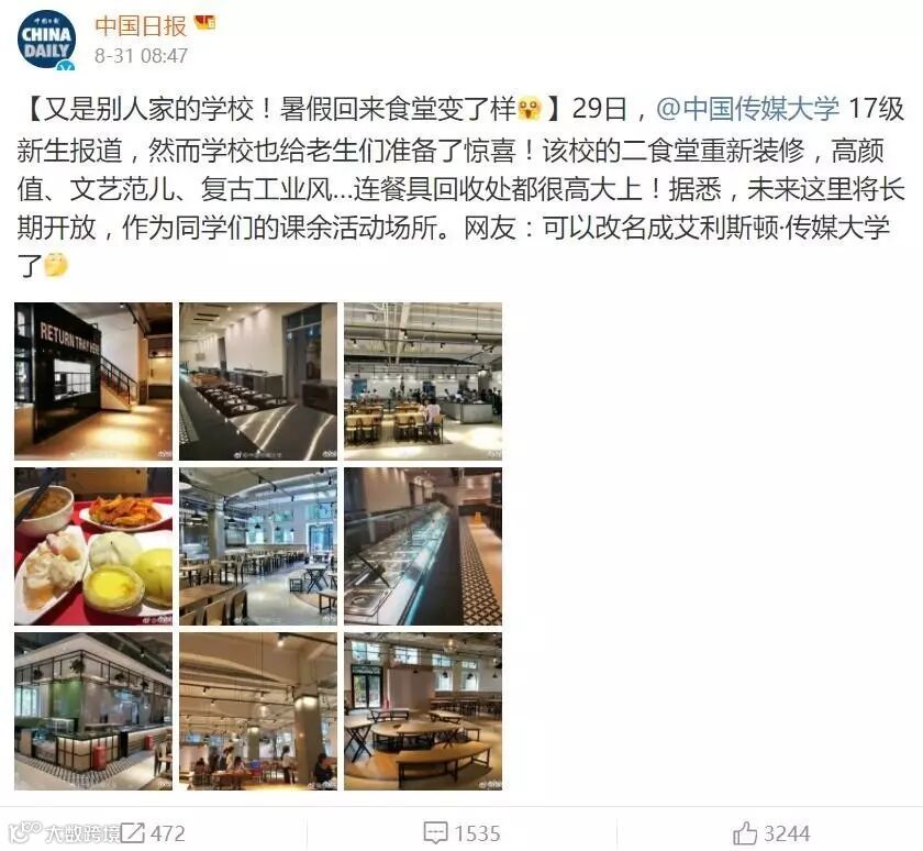 比如中国传媒大学的二食堂重新装修后颜值飙升,网友惊呼,可改名成艾利斯顿·传媒大学了!