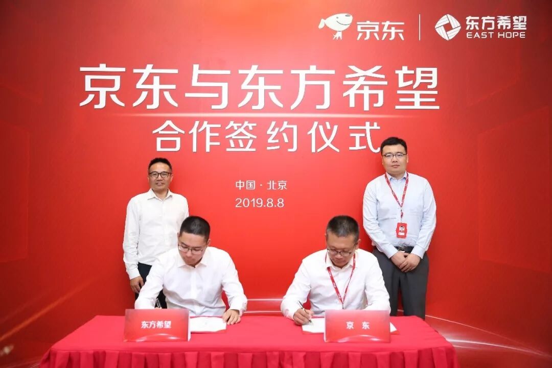 2019年8月8日,京东与东方希望集团在北京京东总部签署合作协议,成为东方希望首个数字化采购的合作伙伴,东方希望集团党支部书记、反舞弊总监张轮大,京东零售集团企业业务事业部副总经理李靖出席签约仪式。