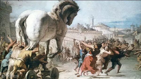 希腊联军围困特洛伊久攻不下,于是假装撤退,留下一具巨大的中空木马,特洛伊守军不知是计,把木马运进城中作为战利品。夜深人静之际,木马腹中躲藏的希腊士兵打开城门,特洛伊沦陷。