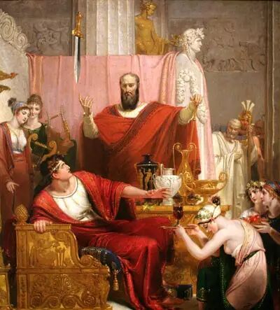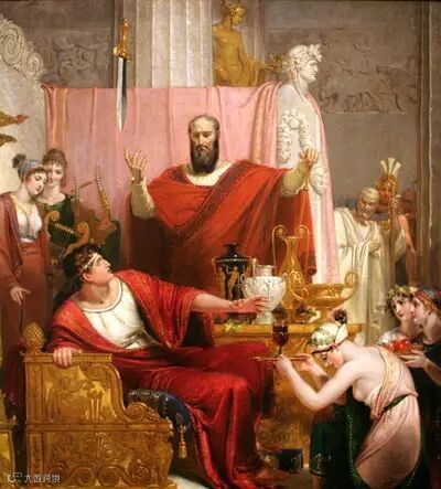 达摩克利斯是希腊神话中暴君迪奥尼修斯的宠臣,他常说帝王多福,以取悦帝王。有一次,迪奥尼修斯让他坐上帝王宝座,在其头顶用马鬃悬挂一把利剑,告诉他大权在握者常朝不保夕,危险就像那把剑一样,随时可能降临。