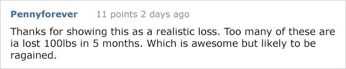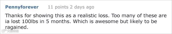 谢谢你展示这个现实的减重过程。 有太多类似于5个月内减100磅的例子,它们看起来很棒,却很可能反弹。