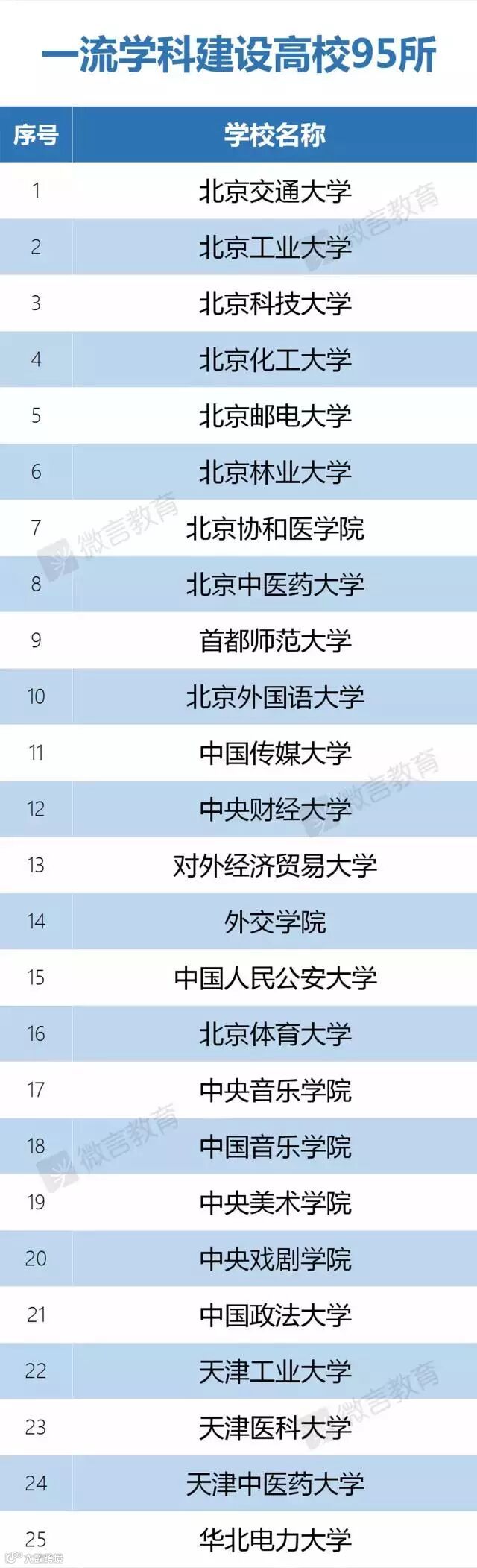 一流学科建设高校共计95所(95 universities will focus on building their preponderant disciplines into first-rate ones),包括北京交通大学、北京工业大学、北京科技大学等。