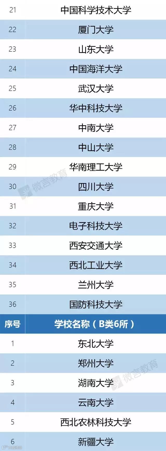 本次公布的“双一流”建设高校及学科名单中共有137所高校,其中,一流大学建设高校共计42所(42 universities and colleges will be developed into first-class educational institutions),这里面A类高校36所,包括北京大学、中国人民大学、清华大学、北京航空航天大学等,B类高校6所,包括东北大学、郑州大学、湖南大学、云南大学、西北农林科技大学、新疆大学。