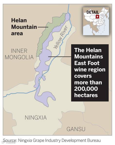 标为紫色,在贺兰山东边山脚,黄河以西的这块大概占地20万公顷的戈壁滩,就是宁夏贺兰山东麓了。