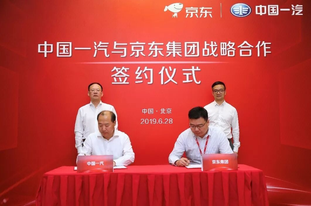 2019年6月28日,京东集团与中国第一汽车集团有限公司(下简称“一汽”)在北京京东总部签署战略合作协议。一汽集团公司党委常委、副总经理邱现东,京东集团高级副总裁、战略合作部负责人胡胜利出席签约仪式,一汽集团公司总经理助理兼战略管理部部长胡咏与京东零售集团企业业务大型客户部总经理李靖代表双方签约。