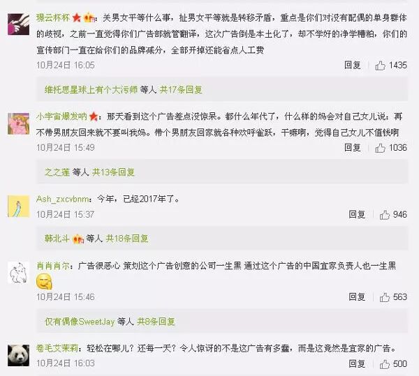 广告播出之后,有不少网友称,宜家最新的电视广告让人很失望。很多人认为“再不带男朋友回来,就别叫我妈”这句台词很不恰当,是对“剩女(leftover women)”的歧视,称广告传递了不恰当的价值观。