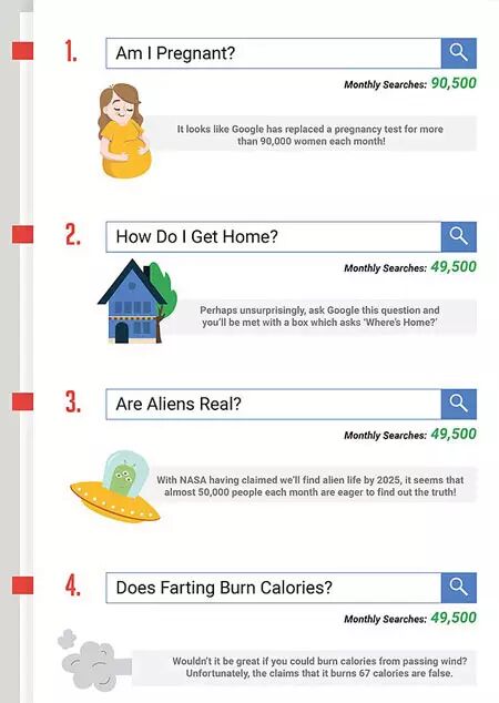 根据Digitaloft公司整理的“20个最奇葩谷歌搜索问题”, 老外们最常搜索的奇葩问题第一名是“我怀孕了吗?”(Am I pregnant?),紧随其后的是“我怎么回家?”(How do I get home?)、“真的有外星人吗?”(Are aliens real?)、“放屁能燃烧脂肪吗?”(Does farting burns calories)。