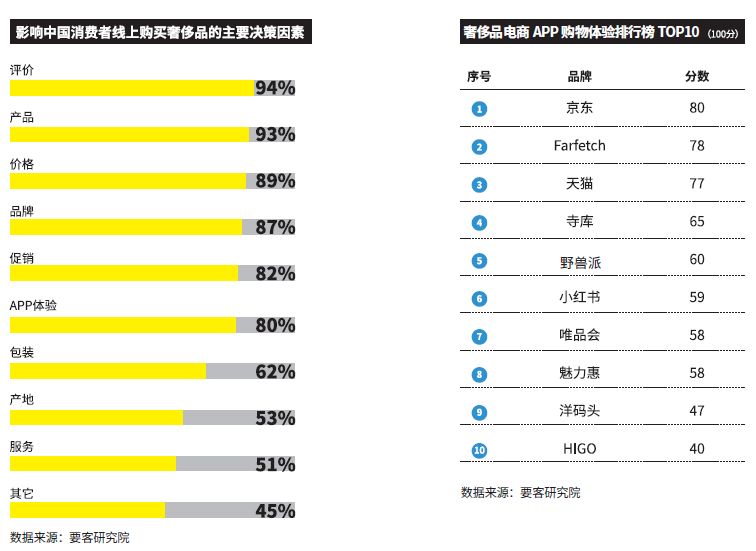 在要客研究院发布的《中国奢侈品电商报告》中,我们也看到,有很多因素在影响着消费者购买奢侈品。在所有影响消费者购买奢侈品的决策因素中,94% 消费者认为会受到评价的影响,其次是产品(93%),第三是价格(89%);但是值得注意的,APP 体验(80%)也是影响消费者线上购买奢侈品的重要因素之一。通过同行评价以及客户评价,京东与Farfetch 的APP 购物体验最受好评,主要涉及APP 的页面设计、响应速度、产品检索、支付方式、订单管理、客服模式、物流服务、产品品质、品牌等级等维度。