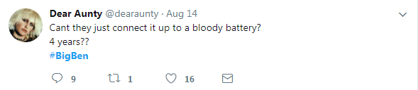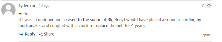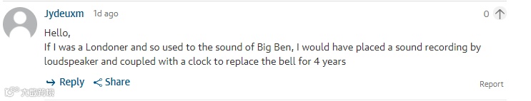 Jydeuxm:如果我是伦敦人而且已经习惯了大本钟钟声了的话,这4年我会用一个扬声器录音外加一块表来代替大本钟