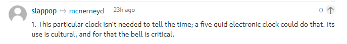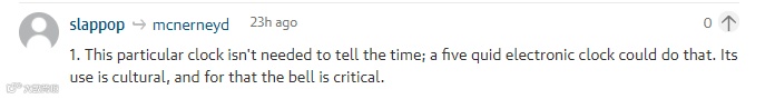 Slappop:大钟的报时功能不是必须的,一个5块钱的表就能搞定,大钟的意义在于文化上,也就因为这一点大钟非常关键